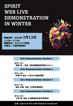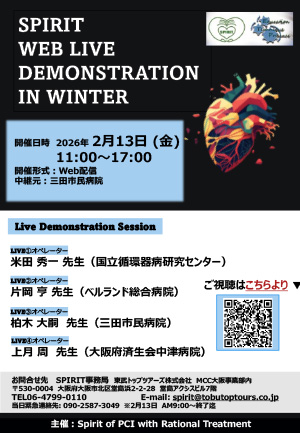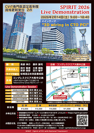 SPIRITは、2009年にKansai-Vascular Intervention & Catheter Therapeutics(K-VIC)として発足し、心疾患患者の診断また、治療方法が確立されていない分岐部病変及び慢性完全閉塞の治療の向上を図り、地域医療の発展に寄与する目的として参りました。また、2017年には、Complex PCIの理論的治療の更なる向上を目指す意図をより明確にする為、SPIRIT(Spirit of PCI with Rational Treatment)と名称変更いたしました。これからも複雑病変や様々な知識や技術を当会にて情報共有させていただき、医療現場に役立てていただけるよう、引き続きご支援賜りますようお願い申し上げます。
